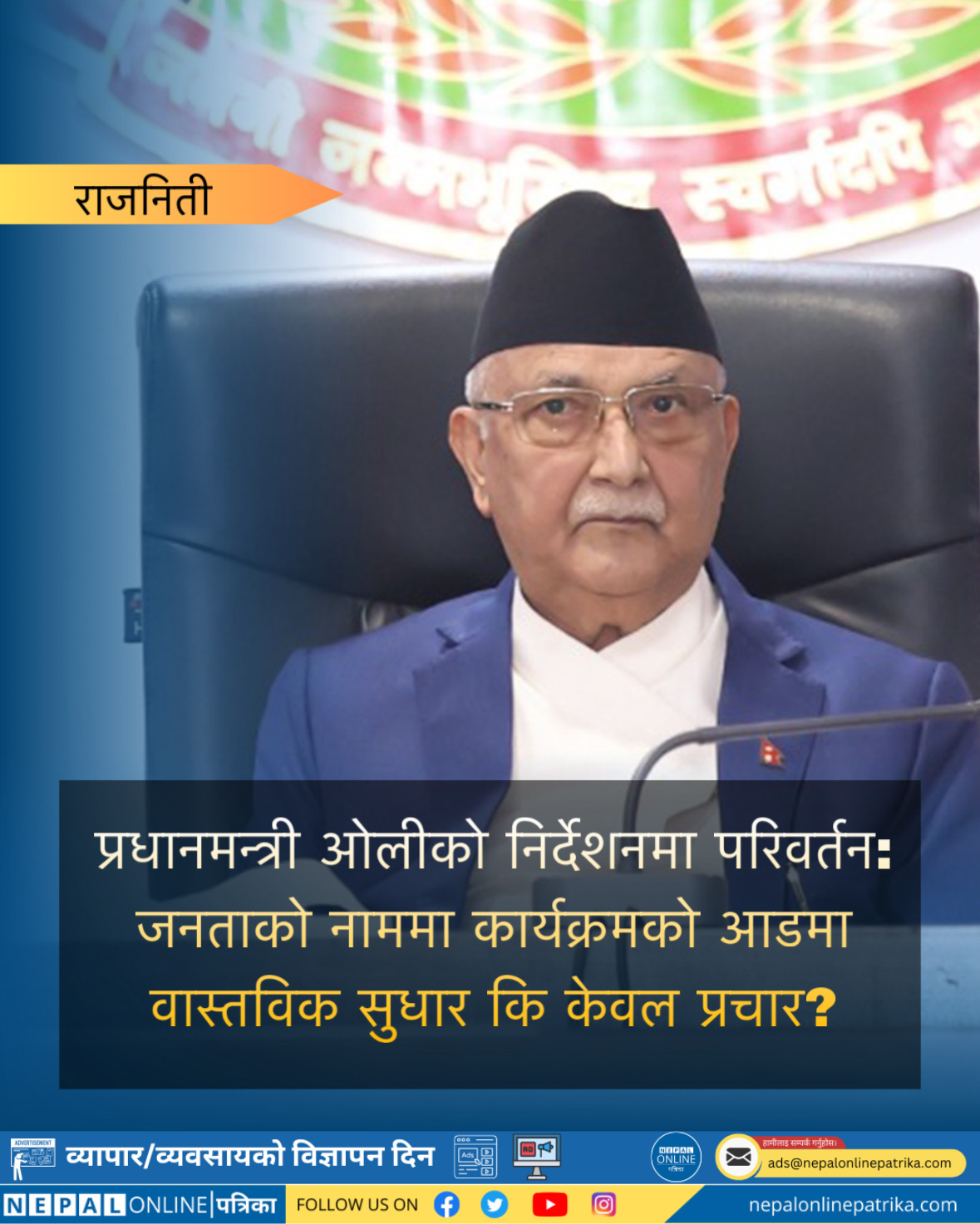 आज प्रधानमन्त्री तथा मन्त्रिपरिषद्को कार्यालयमा आयोजित उच्चस्तरीय बैठकमा मन्त्री, सचिवलगायतलाई निर्देशन दिँदै, प्रधानमन्त्री ओलीले अबदेखि कार्यक्रमहरू प्रधानमन्त्री, मुख्यमन्त्री वा अन्य उच्च पदाधिकारीहरूको नाममा नराखी जनताको नाममा गर्न आदेश दिए। सचिवालयले यो निर्देशनलाई सरकारको जनताप्रति जिम्मेवारीको प्रमाणका रूपमा प्रस्तुत गरेको छ। तर, के यो निर्देशन वास्तवमै जनताको हितका लागि हो, कि यो केवल प्रचारको एउटा नयाँ तरिका हो भन्ने शङ्का उब्जिएको छ।