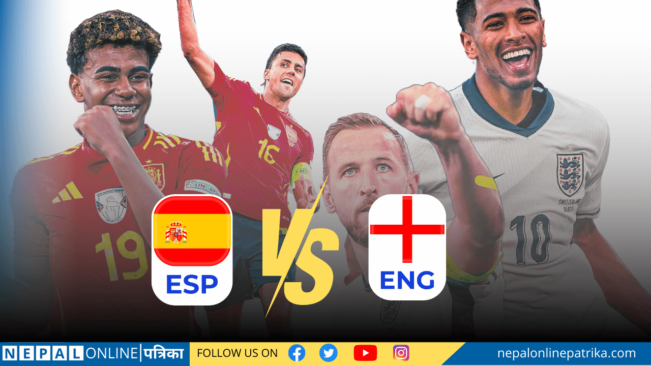 नेपाल अनलाइन पत्रिका। आजको यूरो कप फाइनलमा स्पेन र इंग्ल्यान्ड आमनेसामने हुँदैछन्। खेल बर्लिनको ओलम्पियास्टेडियनमा हुँदैछ। दुबै टोली शानदार फर्ममा छन् र उपाधि जित्ने लक्ष्यसाथ मैदानमा उत्रनेछन्।